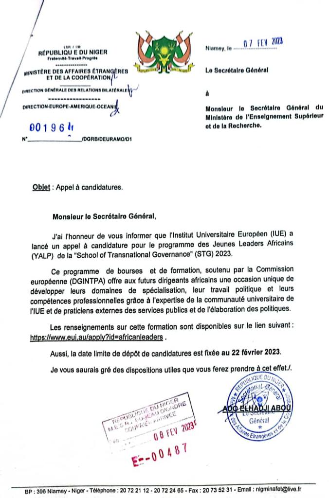 L’Institut Universitaire Européen (IUE) lance un appel à candidature pour le programme des jeunes leaders Africains (YALP) de la “School of Transnational Gouvernance” (STG) 2023.