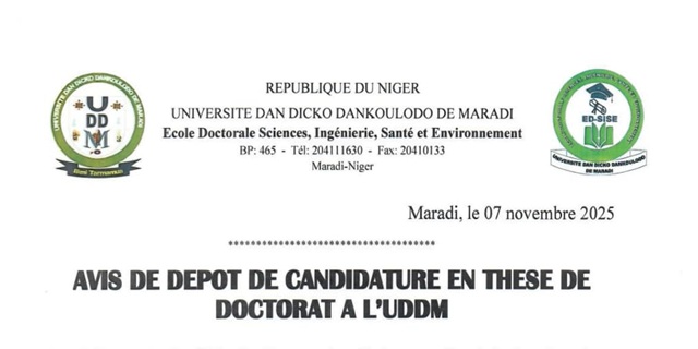 Le Directeur de I’Ecole Doctorale Sciences, Ingénierie, Santé et Environnement (ED-SISE) de l’Université Dan Dicko Dankoulodo de Maradi porte à la connaissance des Etudiants, des Enseignants chercheurs et Chercheurs et des Enseignants Technologues de l’ouverture de dépôt des dossiers de candidature d’admission en thèse de doctorat au titre de l’année académique 2025 -2026 du 07 novembre au 05 décembre 2025.