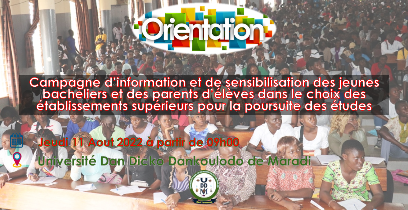 Alors que les bacheliers s’apprêtent à formuler leurs vœux et leur choix d’orientation, peut-être faites-vous partie de ceux qui n’ont pas encore une idée claire de leur projet professionnel. L’enseignement supérieur offre un panel de formations post bac et vous cherchez encore votre voie ? Venez ce jeudi 11 aout 2022 à l’Université Dan Dicko Dankoulodo de Maradi à partir de 09H00.