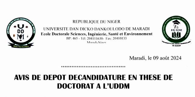 Le Directeur de l’Ecole Doctorale ‘Sciences, Ingénierie, Santé et Environnement’ (ED-SISE) de l’Université Dan Dicko Dankoulodo de Maradi porte à Lire la suite… AVIS DE DEPOT DE CANDIDATIIRE EN THESE DE DOCTORAT A L’UDDM
