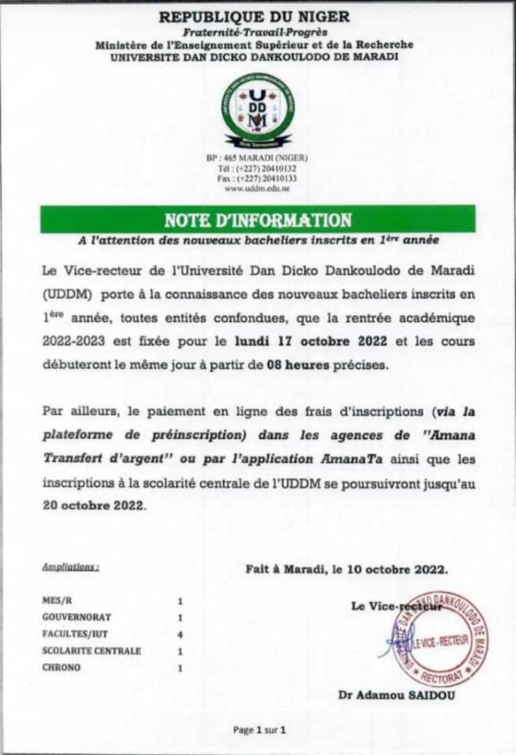 A l’ attention des nouveaux bacheliers retenus en première année à l’Université Dan Dicko Dankoulodo de Maradi pour la rentrée académique 2022-2023.