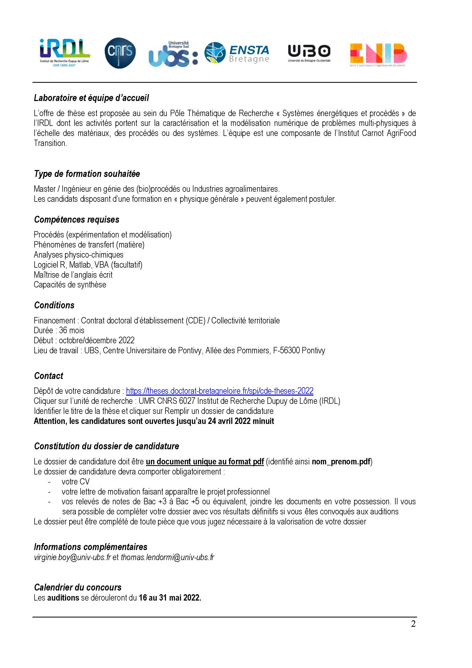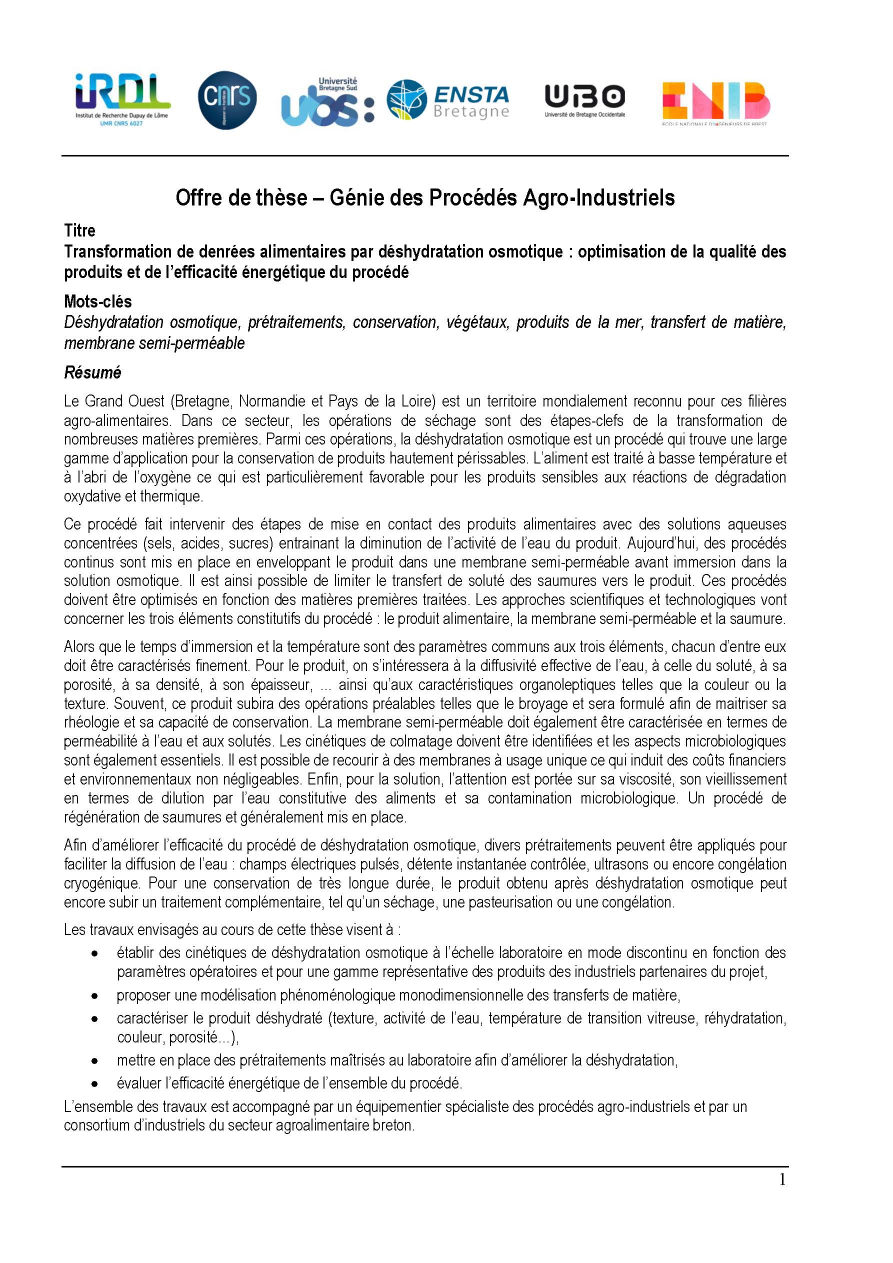 Offre de thèse – Génie des Procédés Agro-Industriels